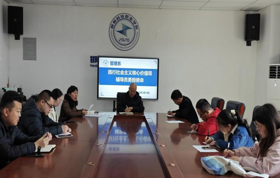 二、辅导员会议。3月18日上午8:30在207会议室召开“践行社会主义核心价值观,辅导员勇担使命”辅导员会议。会上,侯贵宾书记强调要通过打造教室文化、宿舍文化加强学生社会主义核心价值观的培养,助力他们成长为有担当、有素养的新时代青年。吴勇副主任说明了星级文明宿舍的评比办法。