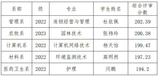 按照河北省教育厅、河北省财政厅关于印发《河北省普通本科高校高等职业学校国家奖学金实施细则的通知》(冀教财〔2017〕10号)、《邯郸科技职业学院国家奖学金评审管理细则》(邯科职办〔2020〕23号)等文件精神和要求,经个人申请、各系初评、学院国家奖学金评审委员会审核和表决,现将我校拟推荐的2023-2024学年国家奖学金名单及综合评审分数公示如下。如有异议,请向学院学生工作部反映。