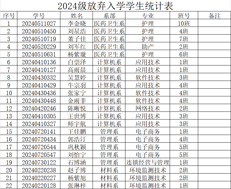 依据《普通高等学校学生管理规定》(教育部令第41号),已被高校录取的新生,应按高校规定时间及要求办理入学手续,对未经高校同意逾期不入学的新生,视为自动放弃入学资格。截至2024年10月11日,李金晓等45名新生无正当事由逾期未到校报到或报到后申请放弃入学资格,拟按照放弃入学资格处理,不予注册学籍,现予以公示,具体名单见附件。