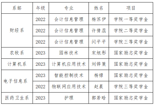 因2024年国家奖助学金提标扩面,我院国家奖学金追加名额后,国家励志奖学金及学院奖学金相应调整。根据《邯郸科技职业学院国家励志奖学金评审管理细则(试行)(邯科职办〔2020〕24号》和《邯郸科技职业学院学金评定办法(修订)(邯科职办〔2024〕10号》文件精神,经个人申请、各系评审、学院审核,拟推荐以下学生获得国家励志奖学金及学院奖学金。结果公示如下,如有异议,请向学院学生工作部反映。