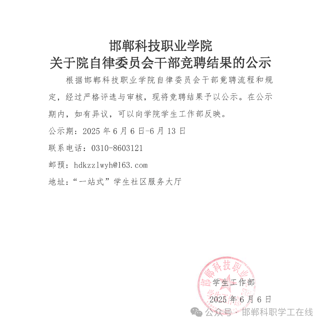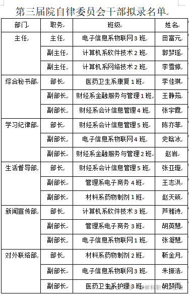 经专业评委团(由学生工作部老师、往届优秀干部代表组成)从个人优势,岗位认识,工作设想等多维度综合评分,结合民主投票结果,最终确定了新一届自律委员会拟定人选。本次竞选始终秉持公平、公正、公开原则,全程接受师生监督,确保每一份努力都得到公正评判。最终选出18名新生加入自律会,现将录取名单公布如下,试用期两个月。