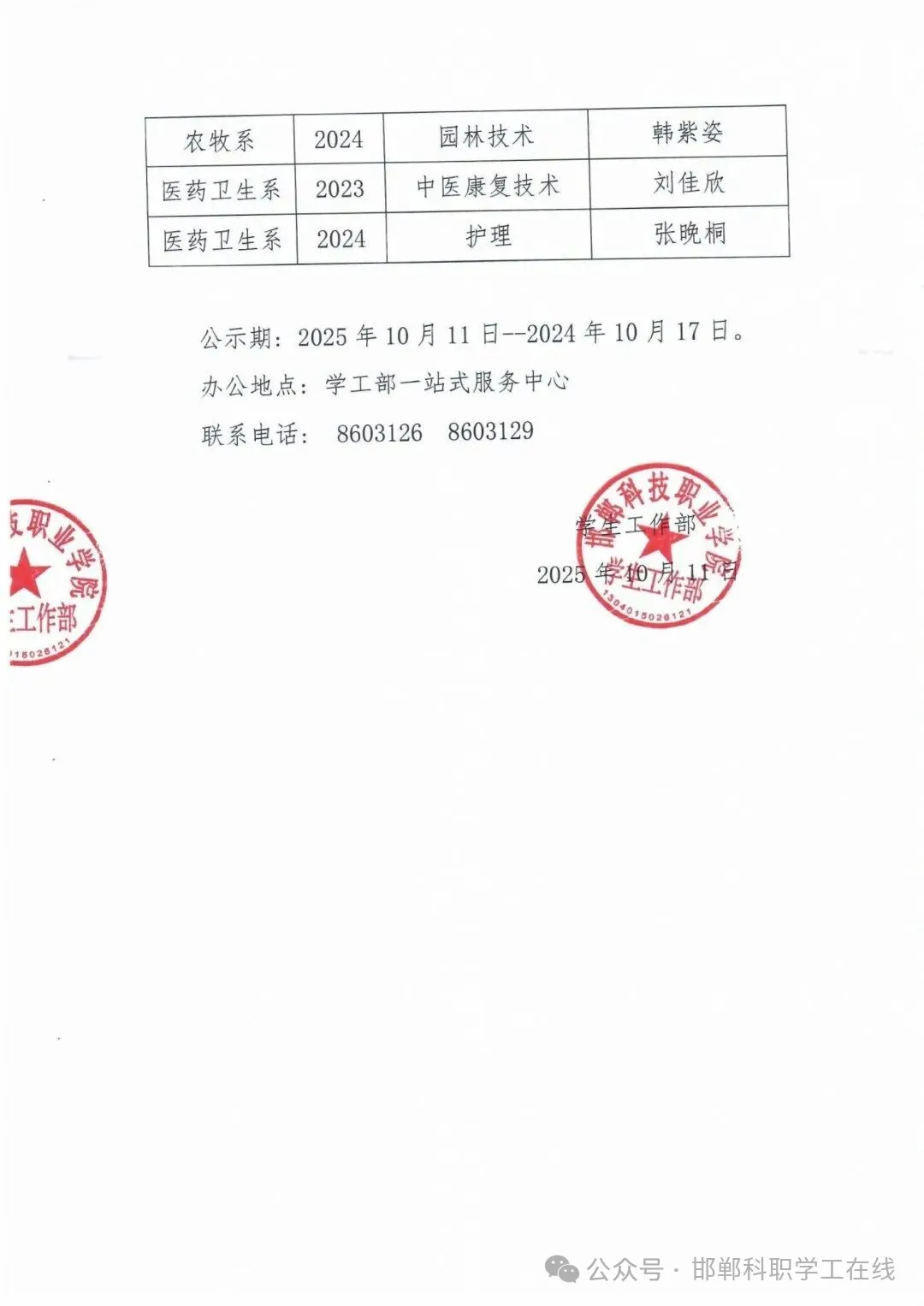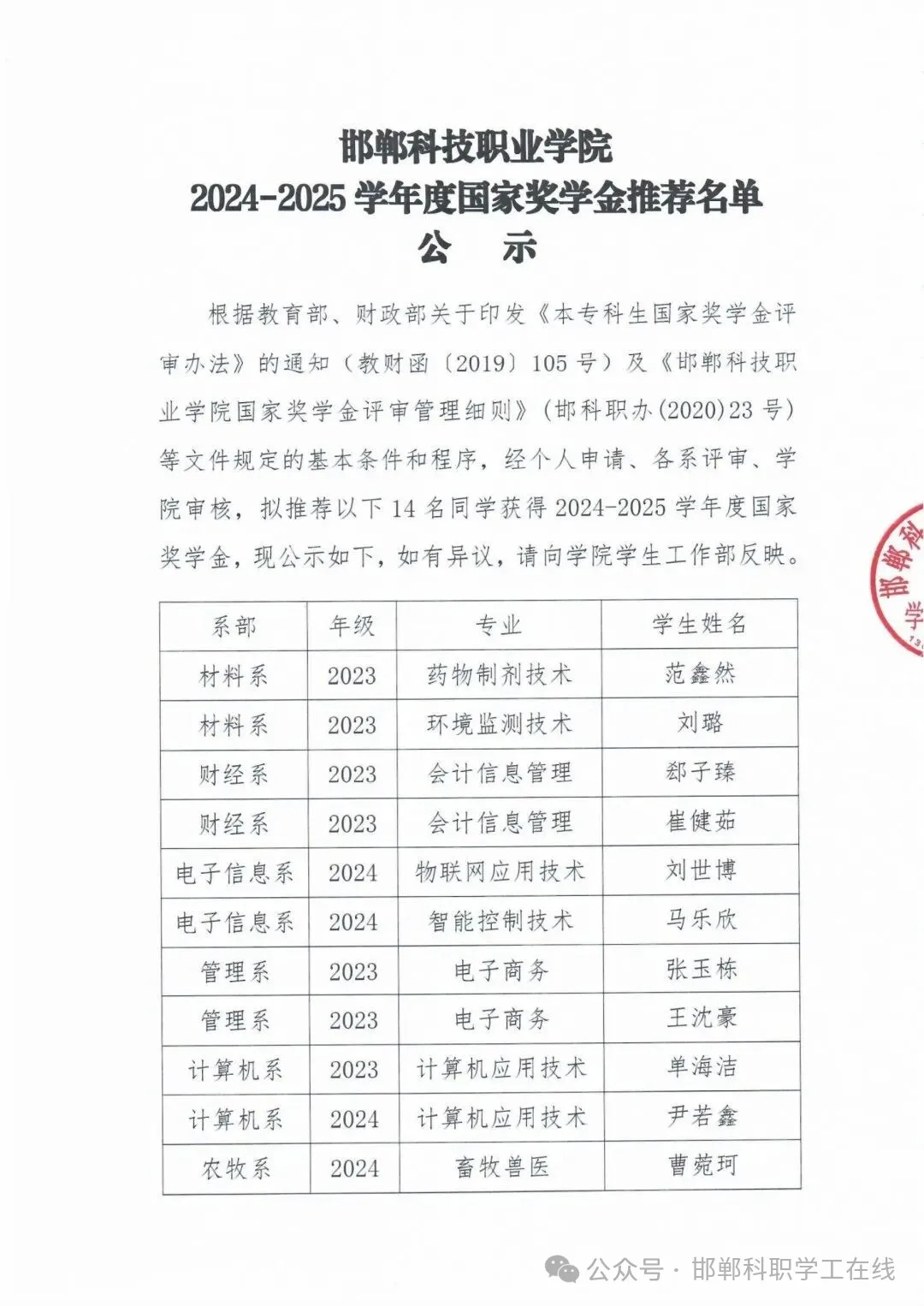 邯郸科技职业学院 2024-2025学年度国家奖学金推荐名单