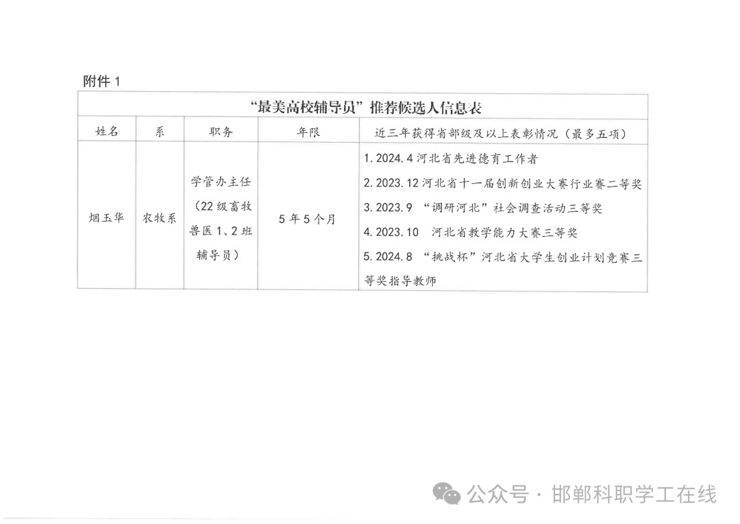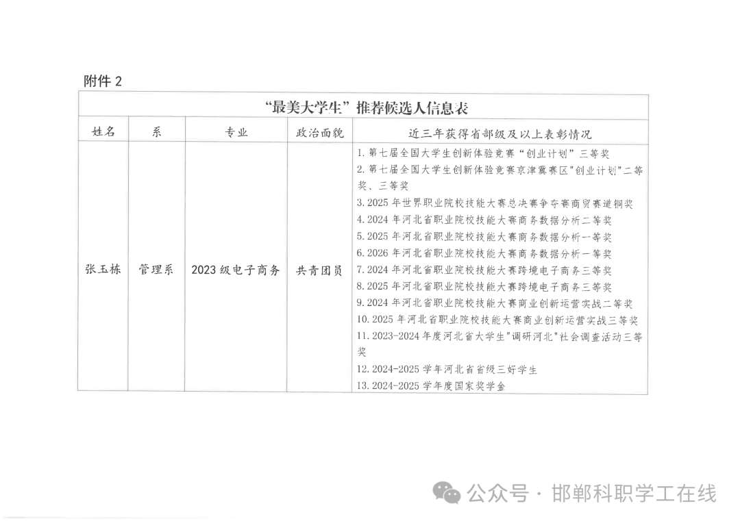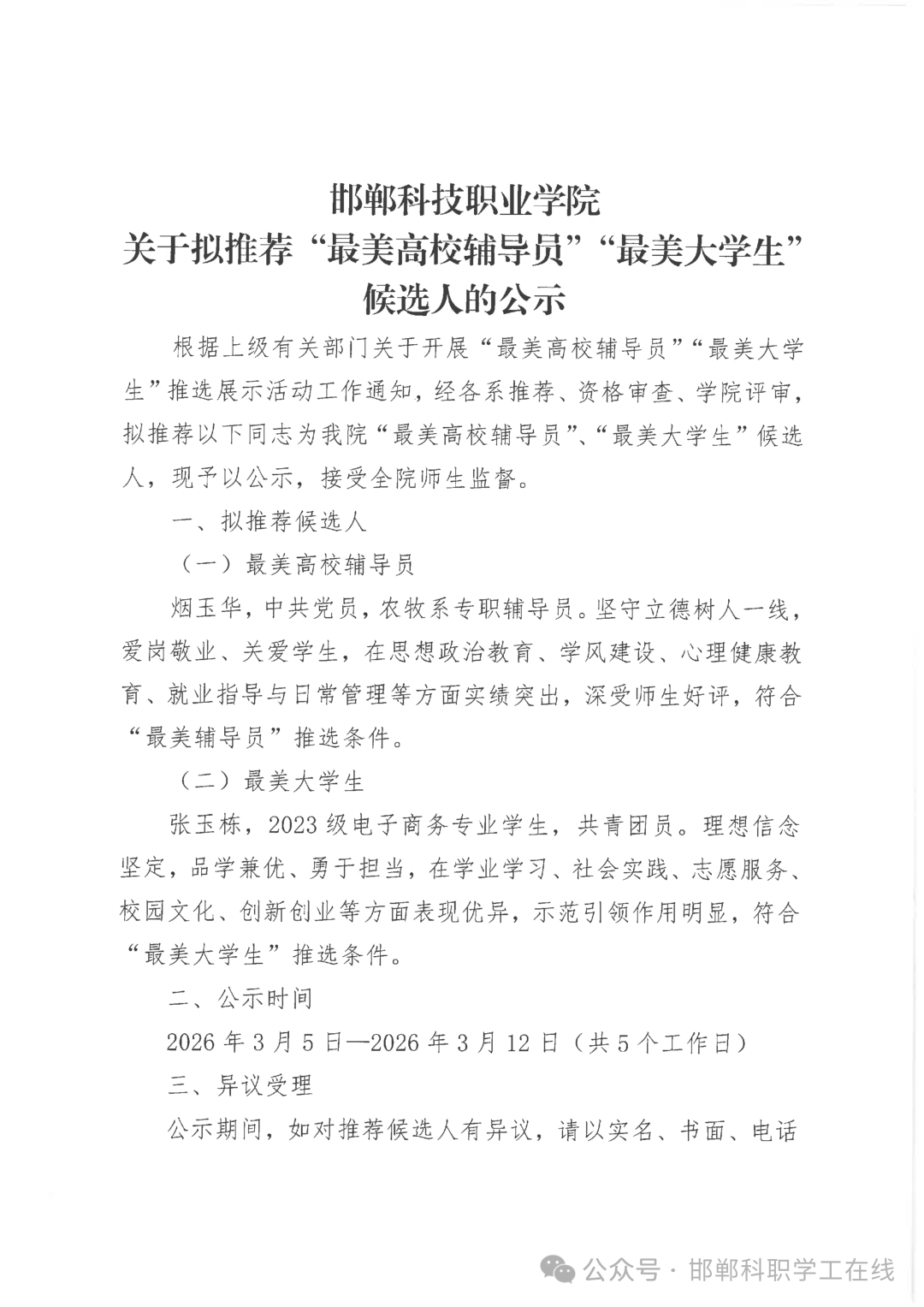 邯郸科技职业学院关于拟推荐“最美高校辅导员”、“最美大学生”候选人的公示